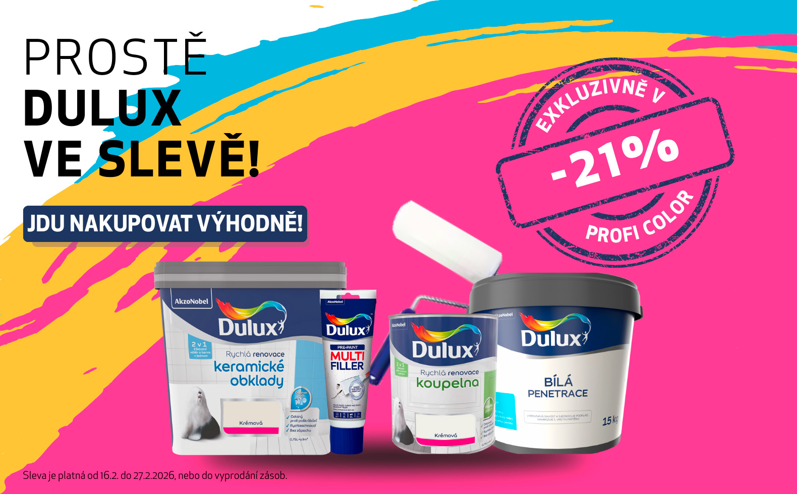 Od 16. února do 27. února pro vás máme skvělou zprávu – na veškerý sortiment DULUX v prodejnách PROFI COLOR získáte slevu 21%.